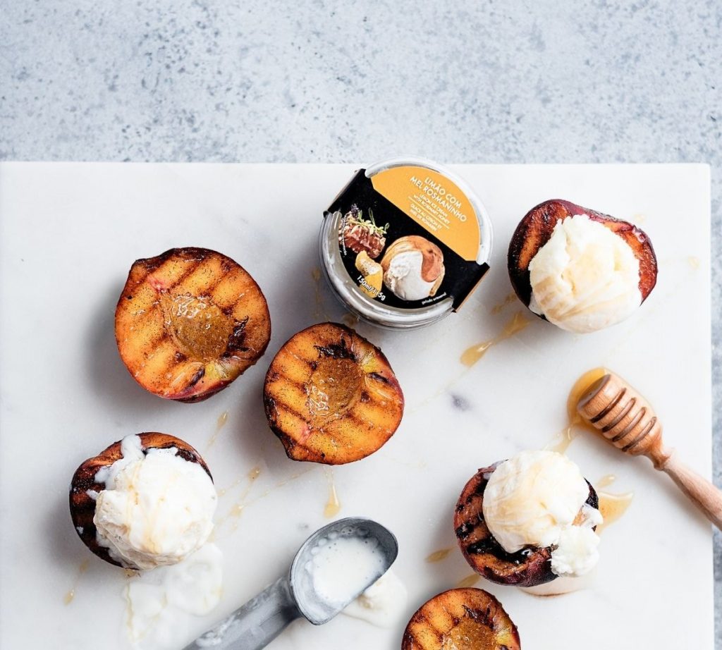 - Sirva os pêssegos grelhados mornos com uma colher de gelado de Limão com Mel e Rosmaninho por cima da metade. Decore com um fio de mel e disfrute!